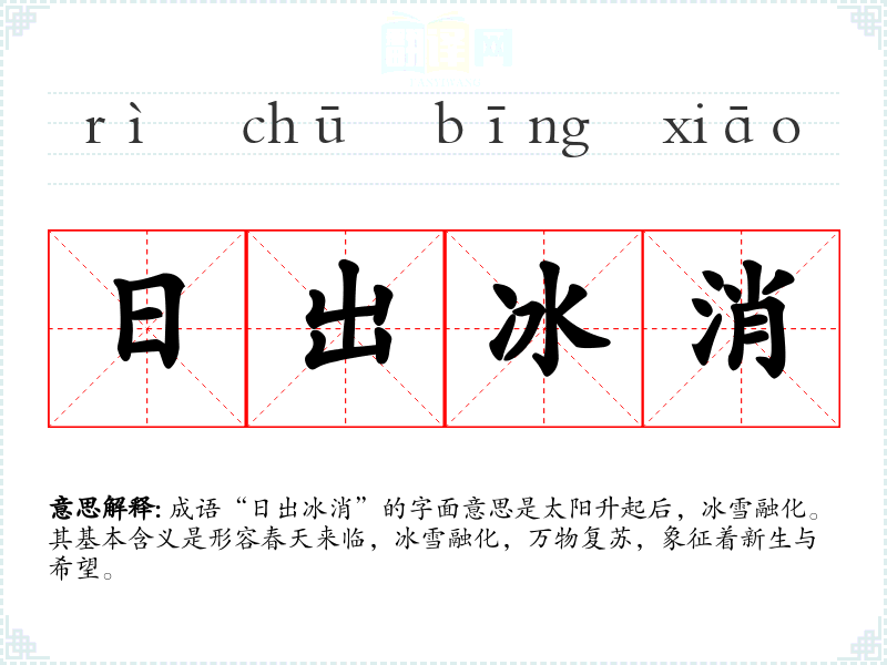 成语“日出冰消”的字面意思是太阳升起后,冰雪融化。其基本含义是形容春天来临,冰雪融化,万物复苏,象征着新生与希望。