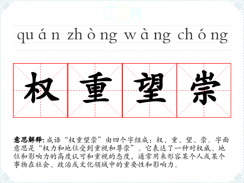 在英语中,可以用“authority”或“prestige”来表达类似的含义,但可能没有直接与“权重望崇”完全对应的成语。这反映了不同文化对权威的认知和表达方式的不同。