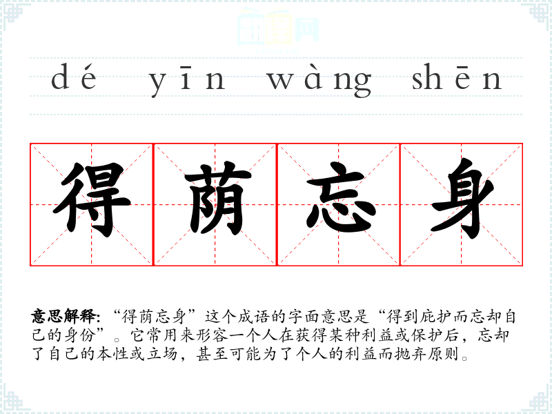 “得荫忘身”这个成语的字面意思是“得到庇护而忘却自己的身份”。它常用来形容一个人在获得某种利益或保护后,忘却了自己的本性或立场,甚至可能为了个人的利益而抛弃原则。