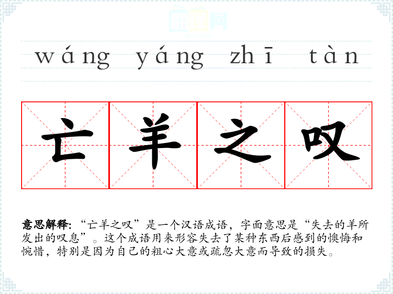 “亡羊之叹”是一个汉语成语,字面意思是“失去的羊所发出的叹息”。这个成语用来形容失去了某种东西后感到的懊悔和惋惜,特别是因为自己的粗心大意或疏忽大意而导致的损失。