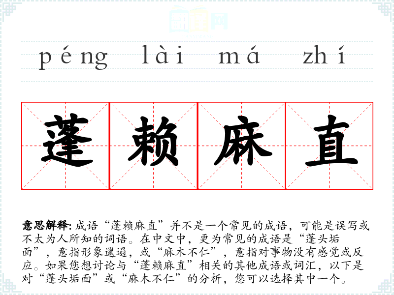 成语“蓬赖麻直”并不是一个常见的成语,可能是误写或不太为人所知的词语。在中文中,更为常见的成语是“蓬头垢面”,意指形象邋遢,或“麻木不仁”,意指对事物没有感觉或反应。如果您想讨论与“蓬赖麻直”相关的其他成语或词汇,以下是对“蓬头垢面”或“麻木不仁”的分析,您可以选择其中一个。
