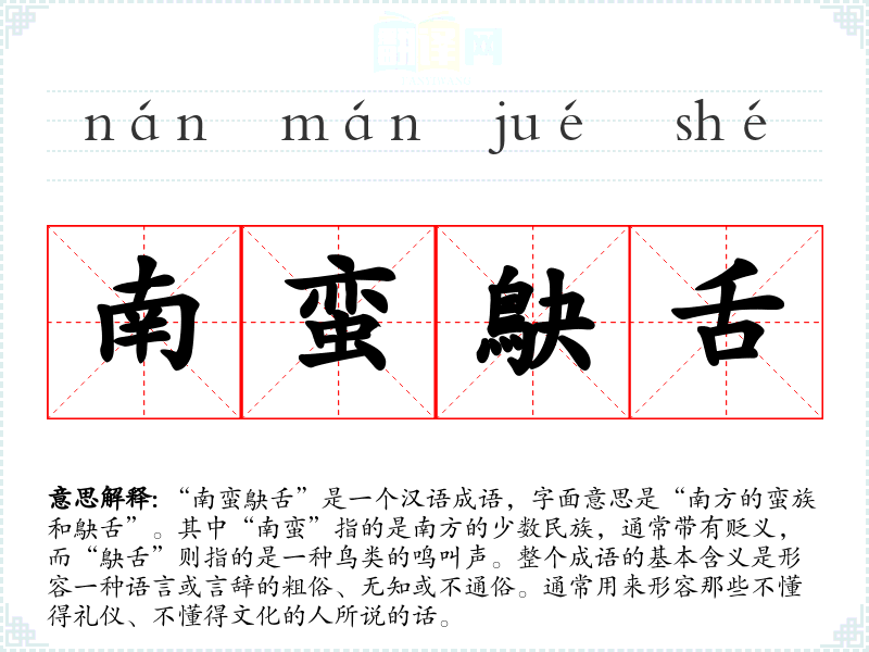 “南蛮鴃舌”是一个汉语成语,字面意思是“南方的蛮族和鴃舌”。其中“南蛮”指的是南方的少数民族,通常带有贬义,而“鴃舌”则指的是一种鸟类的鸣叫声。整个成语的基本含义是形容一种语言或言辞的粗俗、无知或不通俗。通常用来形容那些不懂得礼仪、不懂得文化的人所说的话。