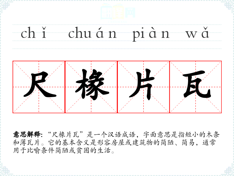 “尺椽片瓦”是一个汉语成语,字面意思是指短小的木条和*瓦片。它的基本含义是形容房屋或建筑物的简陋、简易,通常用于比喻条件简陋或贫困的生活。