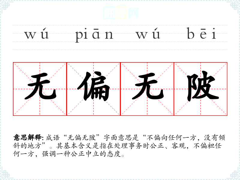 成语“无偏无陂”字面意思是“不偏向任何一方,没有倾斜的地方”。其基本含义是指在处理事务时公正、客观,不偏袒任何一方,强调一种公正中立的态度。