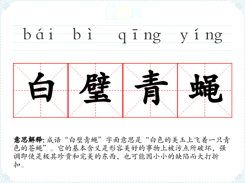 成语“白璧青蝇”字面意思是“白色的美玉上飞着一只青色的苍蝇”。它的基本含义是形容美好的事物上被污点所破坏,强调即使是极其珍贵和完美的东西,也可能因小小的缺陷而大打折扣。