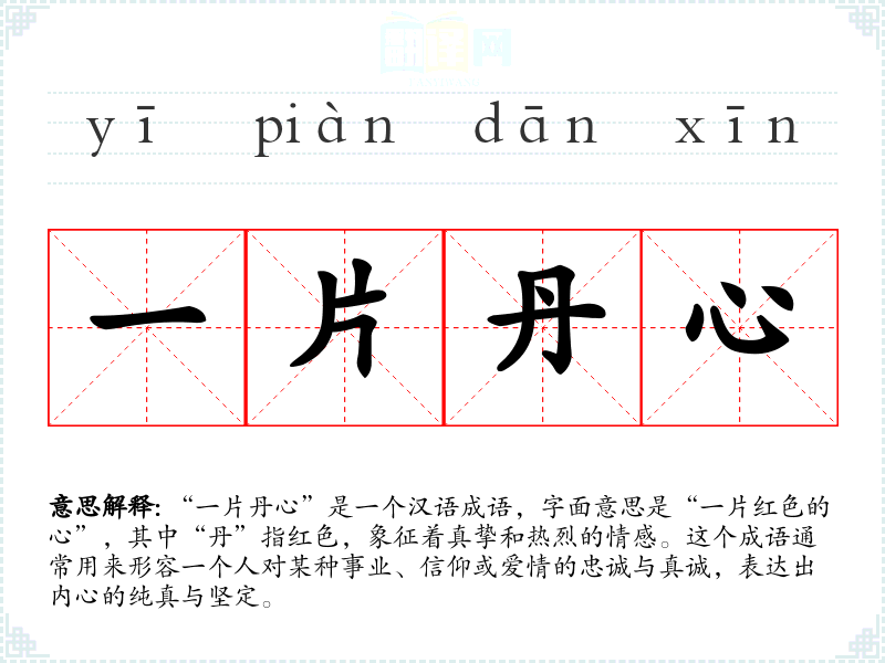 “一片丹心”是一个汉语成语,字面意思是“一片红色的心”,其中“丹”指红色,象征着真挚和热烈的情感。这个成语通常用来形容一个人对某种事业、信仰或爱情的忠诚与真诚,表达出内心的纯真与坚定。