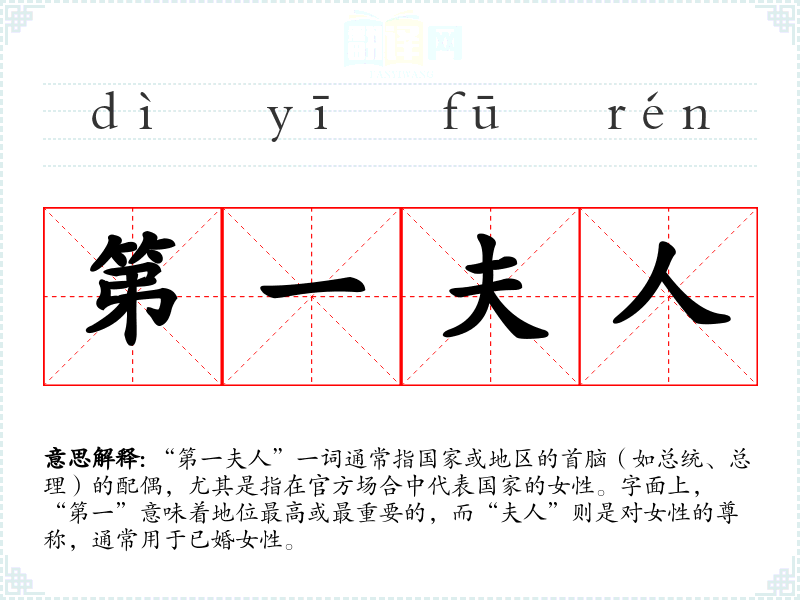 “第一夫人”一词通常指国家或地区的首脑(如总统、总理)的配偶,尤其是指在官方场合中代表国家的女性。字面上,“第一”意味着地位最高或最重要的,而“夫人”则是对女性的尊称,通常用于已婚女性。