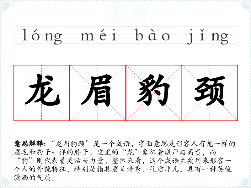 “龙眉豹颈”是一个成语,字面意思是形容人有龙一样的眉毛和豹子一样的脖子。这里的“龙”象征着威严与高贵,而“豹”则代表着灵活与力量。整体来看,这个成语主要用来形容一个人的外貌特征,特别是指其眉目清秀、气质非凡,具有一种英俊潇洒的气质。