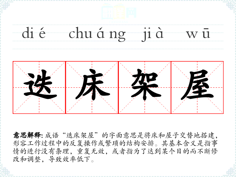 成语“迭床架屋”的字面意思是将床和屋子交替地搭建,形容工作过程中的反复操作或繁琐的结构安排。其基本含义是指事情的进行没有条理,重复无效,或者指为了达到某个目的而不断修改和调整,导致效率低下。