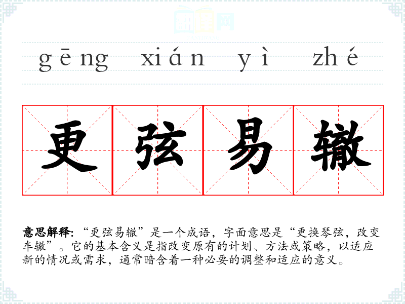 “更弦易辙”是一个成语,字面意思是“更换琴弦,改变车辙”。它的基本含义是指改变原有的计划、方法或策略,以适应新的情况或需求,通常暗含着一种必要的调整和适应的意义。
