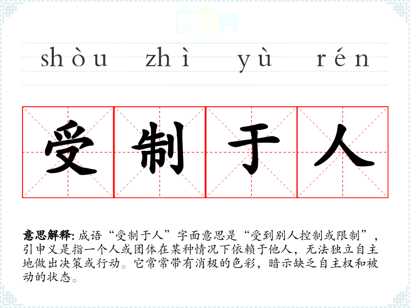成语“受制于人”字面意思是“受到别人控制或限制”,引申义是指一个人或团体在某种情况下依赖于他人,无法独立自主地做出决策或行动。它常常带有消极的色彩,暗示缺乏自主权和被动的状态。