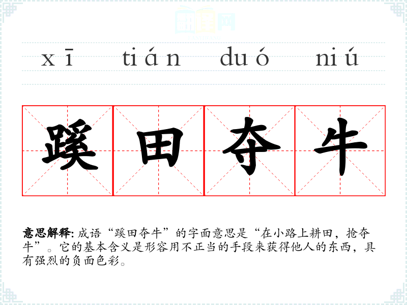成语“蹊田夺牛”的字面意思是“在小路上耕田,抢夺牛”。它的基本含义是形容用不正当的手段来获得他人的东西,具有强烈的负面色彩。