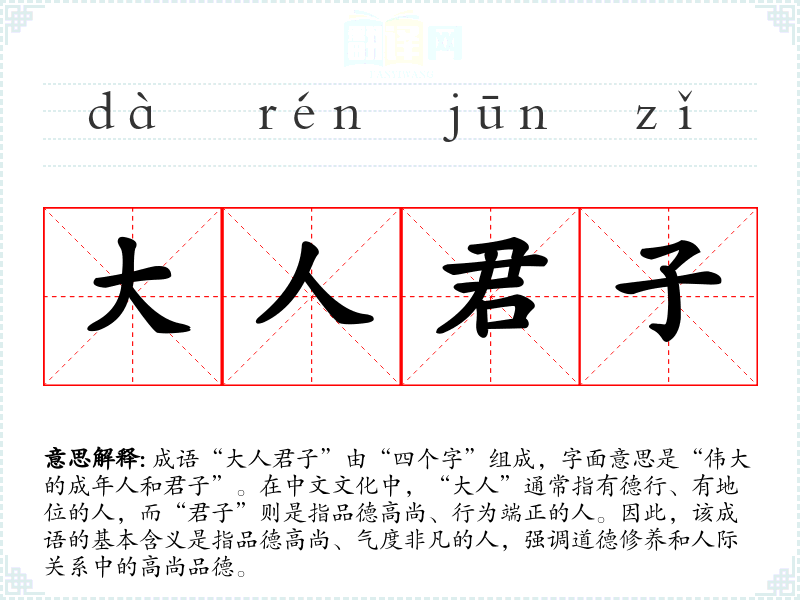 成语“大人君子”由“四个字”组成,字面意思是“伟大的成年人和君子”。在中文文化中,“大人”通常指有德行、有地位的人,而“君子”则是指品德高尚、行为端正的人。因此,该成语的基本含义是指品德高尚、气度非凡的人,强调道德修养和人际关系中的高尚品德。