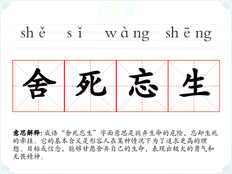 成语“舍死忘生”字面意思是放弃生命的危险,忘却生死的牵挂。它的基本含义是形容人在某种情况下为了追求更高的理想、目标或信念,能够甘愿舍弃自己的生命,表现出极大的勇气和无畏精神。