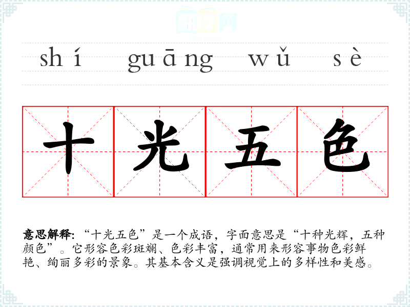 “十光五色”是一个成语,字面意思是“十种光辉,五种颜色”。它形容色彩斑斓、色彩丰富,通常用来形容事物色彩鲜艳、绚丽多彩的景象。其基本含义是强调视觉上的多样性和美感。