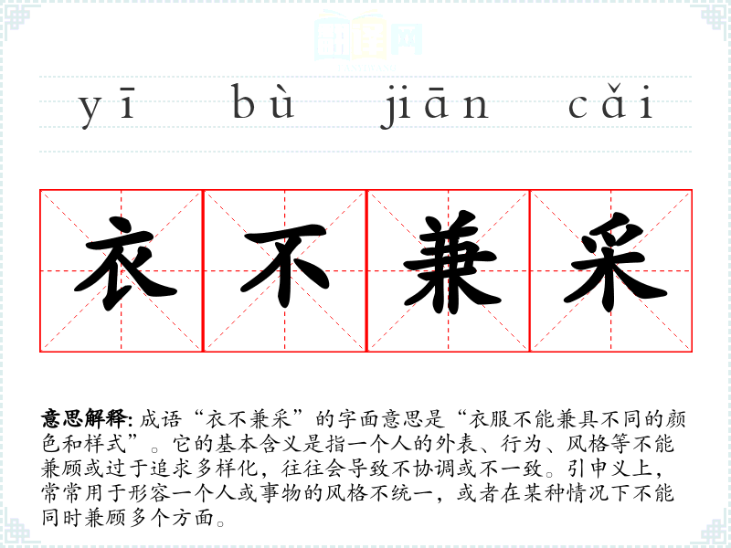 成语“衣不兼采”的字面意思是“衣服不能兼具不同的颜色和样式”。它的基本含义是指一个人的外表、行为、风格等不能兼顾或过于追求多样化,往往会导致不协调或不一致。引申义上,常常用于形容一个人或事物的风格不统一,或者在某种情况下不能同时兼顾多个方面。