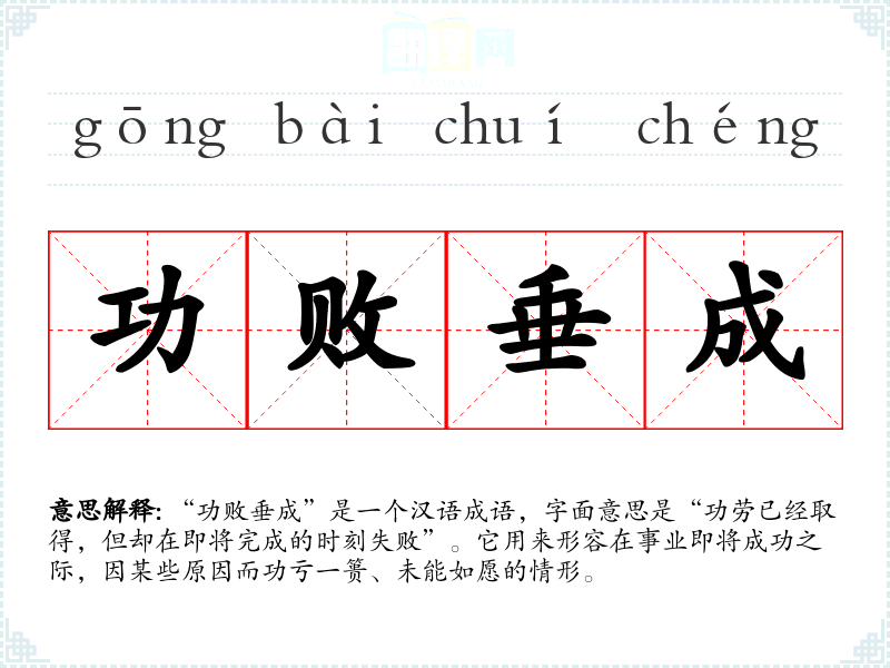 “功败垂成”是一个汉语成语,字面意思是“功劳已经取得,但却在即将完成的时刻失败”。它用来形容在事业即将成功之际,因某些原因而功亏一篑、未能如愿的情形。