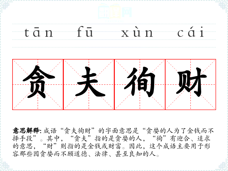 成语“贪夫徇财”的字面意思是“贪婪的人为了金钱而不择手段”。其中,“贪夫”指的是贪婪的人,“徇”有迎合、追求的意思,“财”则指的是金钱或财富。因此,这个成语主要用于形容那些因贪婪而不顾道德、法律、甚至良知的人。