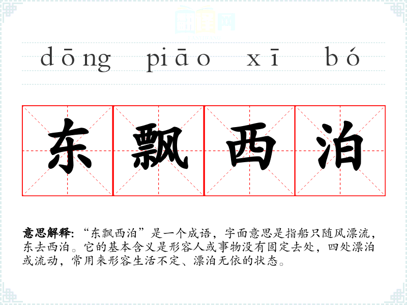 “东飘西泊”是一个成语,字面意思是指船只随风漂流,东去西泊。它的基本含义是形容人或事物没有固定去处,四处漂泊或流动,常用来形容生活不定、漂泊无依的状态。