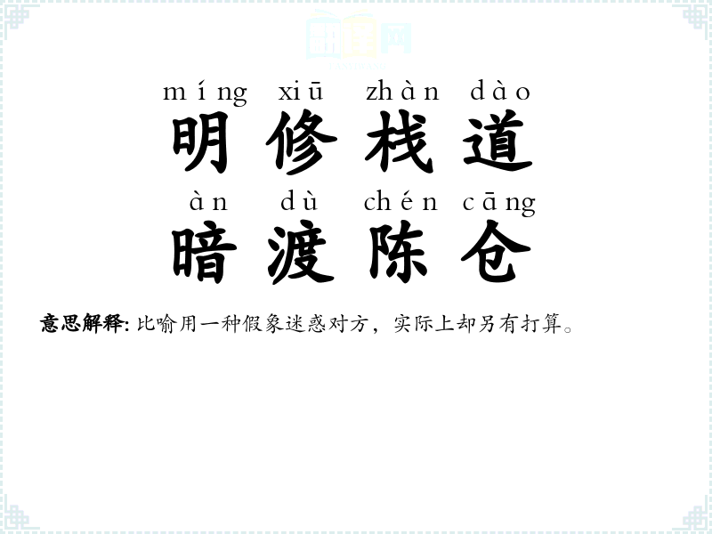 指刘邦将从汉中出兵攻项羽时,故意明修栈道,迷惑对方,暗中绕道奔袭陈仓,取得胜利。陈仓,古县名,在今陕西省宝鸡市东。 |