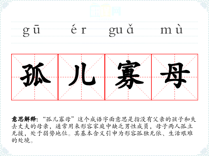 “孤儿寡母”这个成语字面意思是指没有父亲的孩子和失去丈夫的母亲,通常用来形容家庭中缺乏男性成员,母子两人孤立无援,处于弱势地位。其基本含义引申为形容孤独无依、生活艰难的处境。