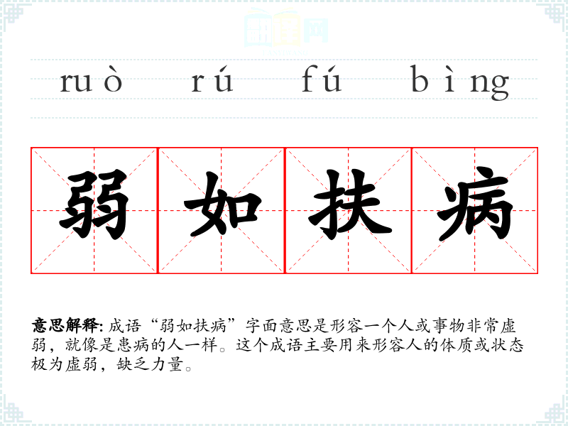 成语“弱如扶病”字面意思是形容一个人或事物非常虚弱,就像是患病的人一样。这个成语主要用来形容人的体质或状态极为虚弱,缺乏力量。