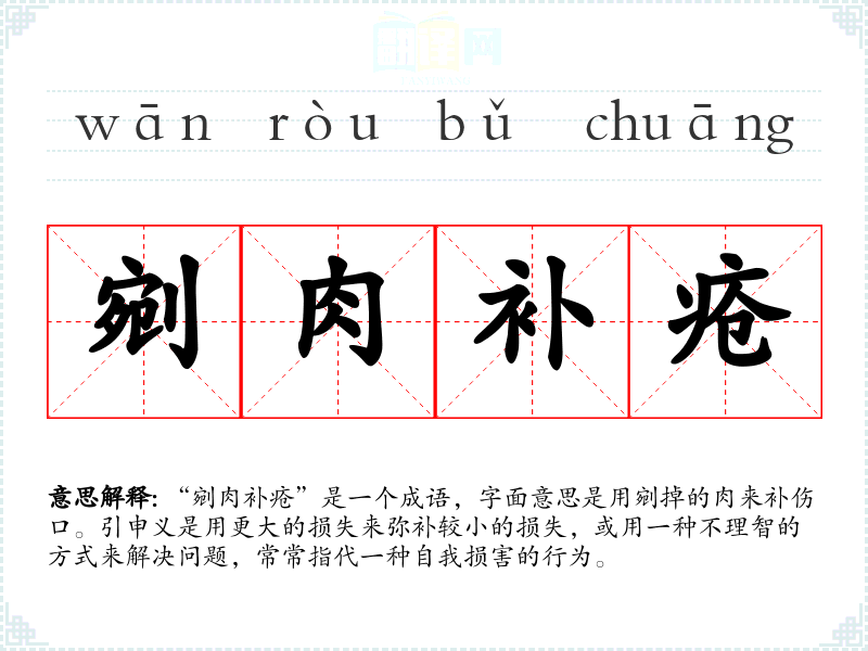 “剜肉补疮”是一个成语,字面意思是用剜掉的肉来补伤口。引申义是用更大的损失来弥补较小的损失,或用一种不理智的方式来解决问题,常常指代一种自我损害的行为。