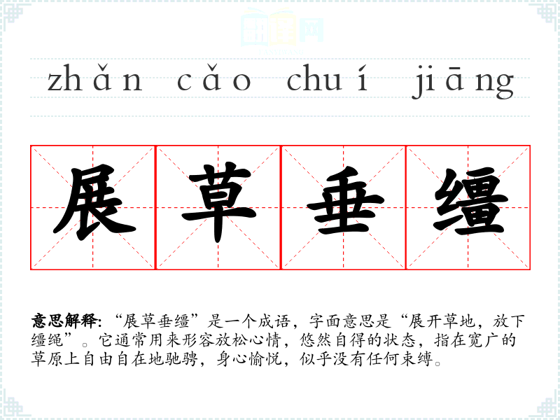 “展草垂缰”是一个成语,字面意思是“展开草地,放下缰绳”。它通常用来形容放松心情,悠然自得的状态,指在宽广的草原上自由自在地驰骋,身心愉悦,似乎没有任何束缚。