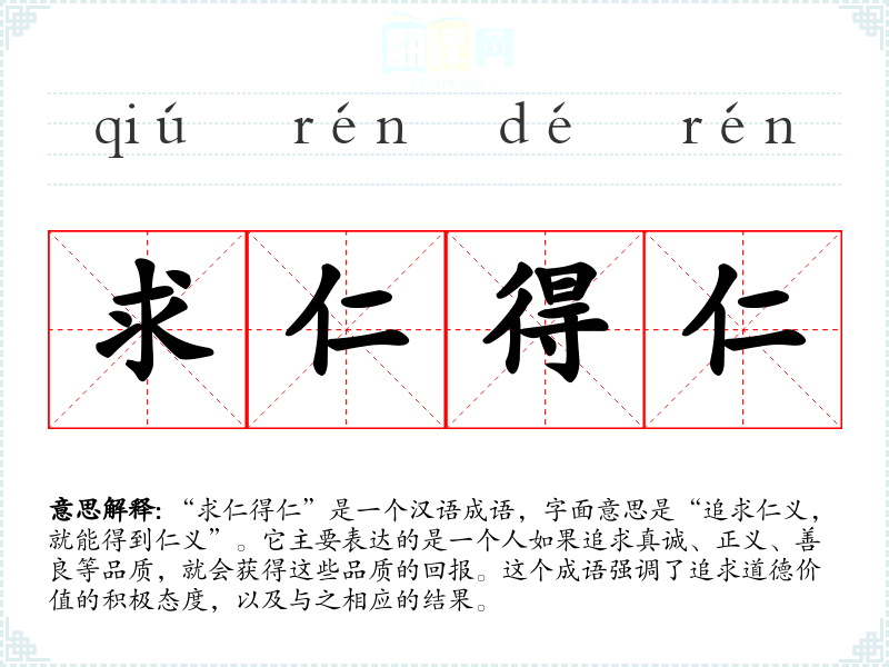 “求仁得仁”是一个汉语成语,字面意思是“追求仁义,就能得到仁义”。它主要表达的是一个人如果追求真诚、正义、善良等品质,就会获得这些品质的回报。这个成语强调了追求道德价值的积极态度,以及与之相应的结果。