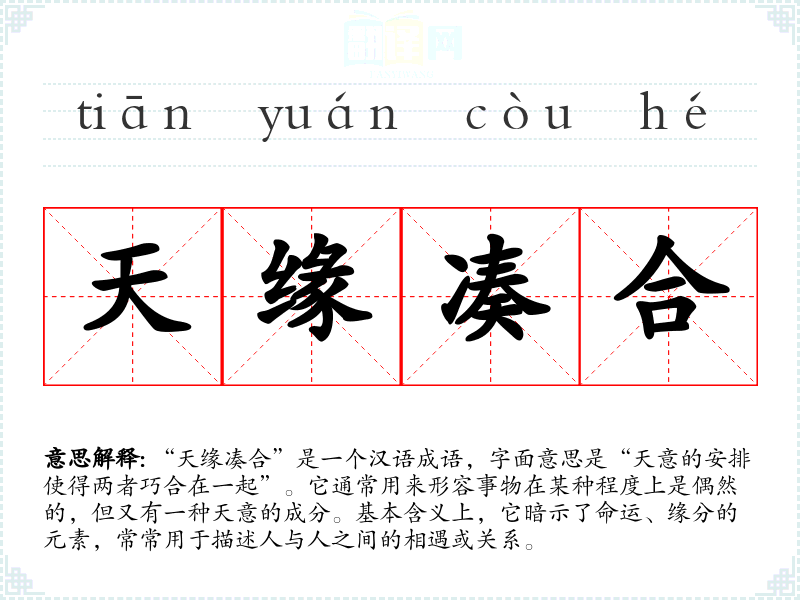 | 天缘凑合 | 天缘:自然的机缘。旧时认为男女结成夫妻是天意所配合。也指事属巧合。 |
