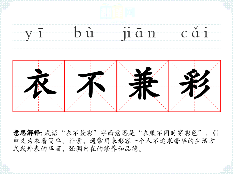 成语“衣不兼彩”字面意思是“衣服不同时穿彩色”,引申义为衣着简单、朴素,通常用来形容一个人不追求奢华的生活方式或外表的华丽,强调内在的修养和品德。