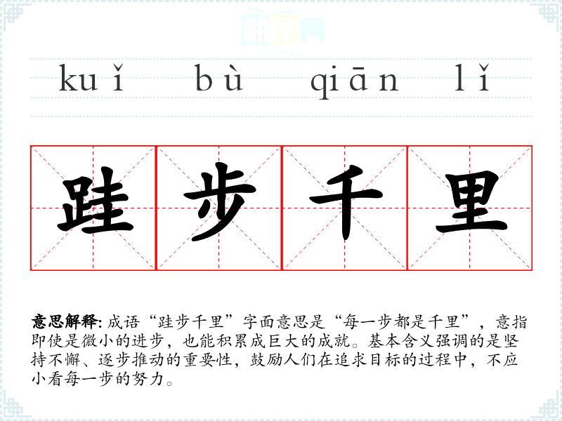 成语“跬步千里”字面意思是“每一步都是千里”,意指即使是微小的进步,也能积累成巨大的成就。基本含义强调的是坚持不懈、逐步推动的重要性,鼓励人们在追求目标的过程中,不应小看每一步的努力。