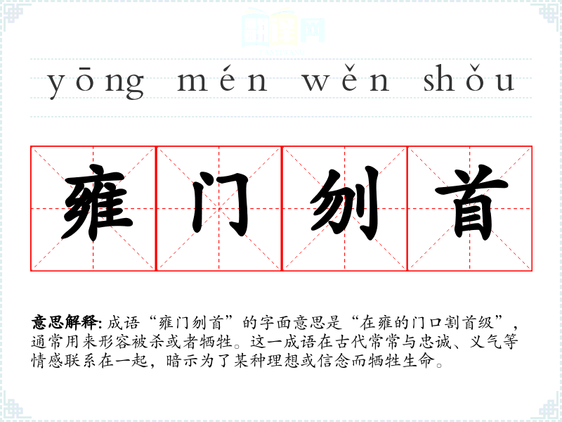 成语“雍门刎首”的字面意思是“在雍的门口割首级”,通常用来形容被杀或者牺牲。这一成语在古代常常与忠诚、义气等情感联系在一起,暗示为了某种理想或信念而牺牲生命。