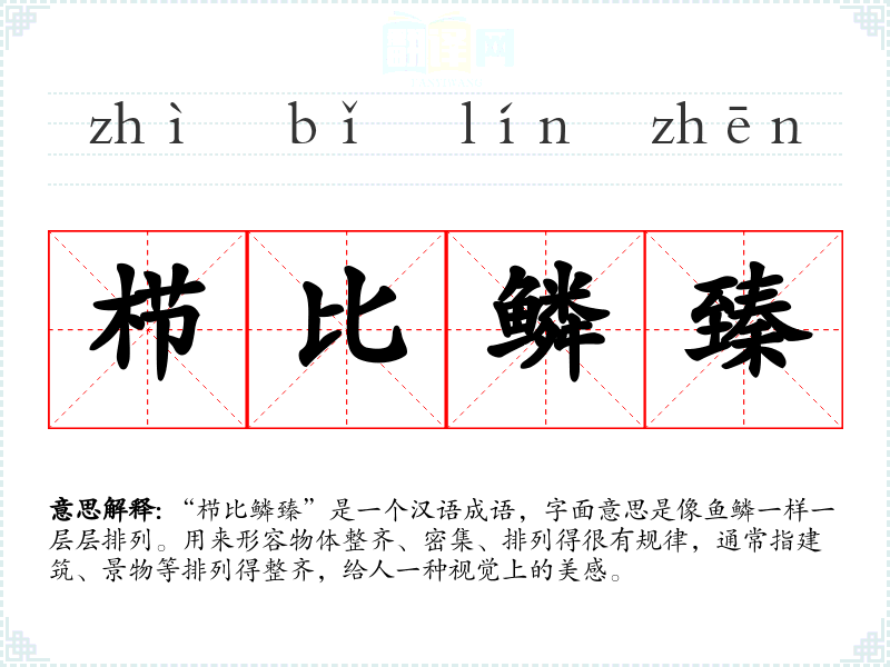 “栉比鳞臻”是一个汉语成语,字面意思是像鱼鳞一样一层层排列。用来形容物体整齐、密集、排列得很有规律,通常指建筑、景物等排列得整齐,给人一种视觉上的美感。
