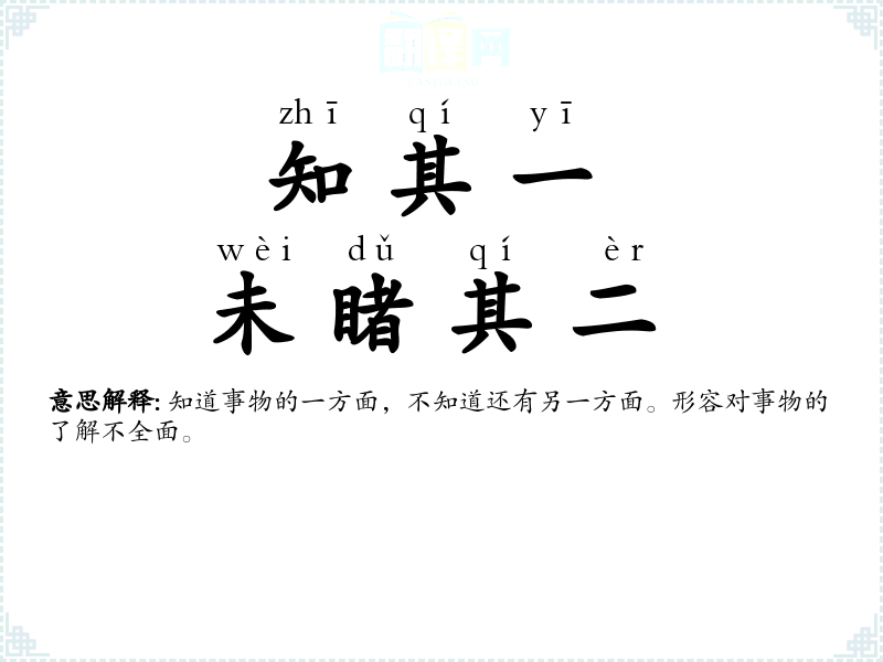 | 知一而不知二 | 知道一是什么,却不知道二是怎么回事。形容了解事物不够全面。 |