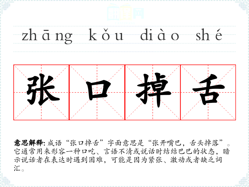 成语“张口掉舌”字面意思是“张开嘴巴,舌头掉落”。它通常用来形容一种口吃、言语不清或说话时结结巴巴的状态,暗示说话者在表达时遇到困难,可能是因为紧张、激动或者缺乏词汇。