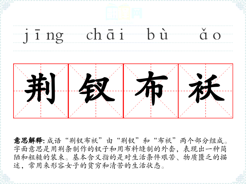 成语“荆钗布袄”由“荆钗”和“布袄”两个部分组成。字面意思是用荆条制作的钗子和用布料缝制的外套,表现出一种简陋和粗糙的装束。基本含义指的是对生活条件艰苦、物质匮乏的描述,常用来形容女子的贫穷和清苦的生活状态。