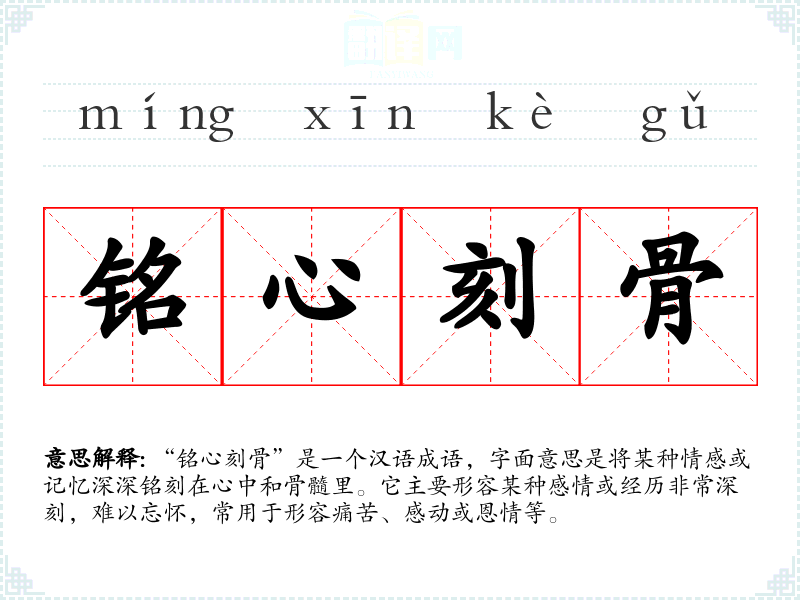 | 铭心刻骨 | 刻写在心上骨上,形容记忆深刻,难以忘记。 |