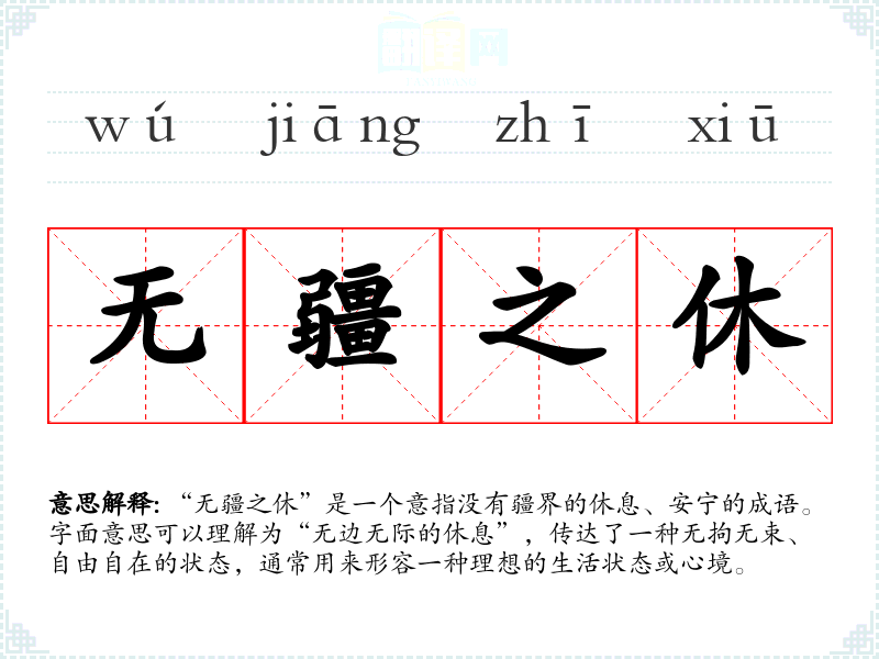 “无疆之休”是一个意指没有疆界的休息、安宁的成语。字面意思可以理解为“无边无际的休息”,传达了一种无拘无束、自由自在的状态,通常用来形容一种理想的生活状态或心境。
