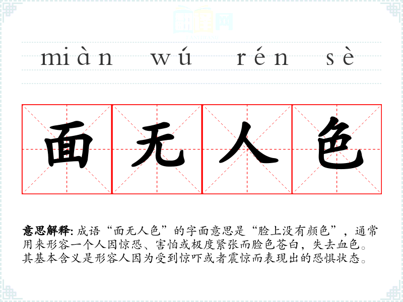 成语“面无人色”的字面意思是“脸上没有颜色”,通常用来形容一个人因惊恐、害怕或极度紧张而脸色苍白,失去血色。其基本含义是形容人因为受到惊吓或者震惊而表现出的恐惧状态。