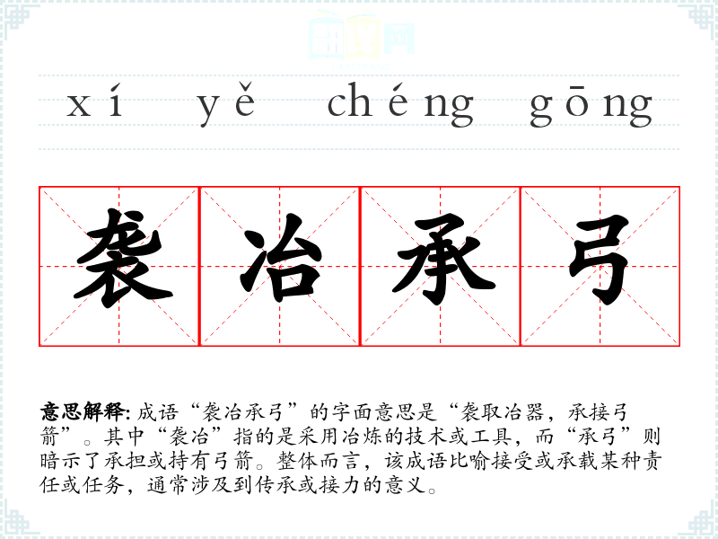 成语“袭冶承弓”的字面意思是“袭取冶器,承接弓箭”。其中“袭冶”指的是采用冶炼的技术或工具,而“承弓”则暗示了承担或持有弓箭。整体而言,该成语比喻接受或承载某种责任或任务,通常涉及到传承或接力的意义。