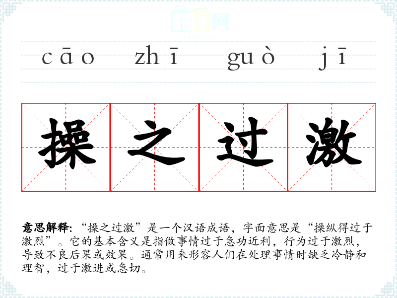 “操之过激”是一个汉语成语,字面意思是“操纵得过于激烈”。它的基本含义是指做事情过于急功近利,行为过于激烈,导致不良后果或效果。通常用来形容人们在处理事情时缺乏冷静和理智,过于激进或急切。