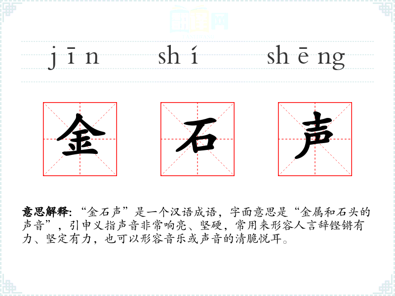 “金石声”是一个汉语成语,字面意思是“金属和石头的声音”,引申义指声音非常响亮、坚硬,常用来形容人言辞铿锵有力、坚定有力,也可以形容音乐或声音的清脆悦耳。