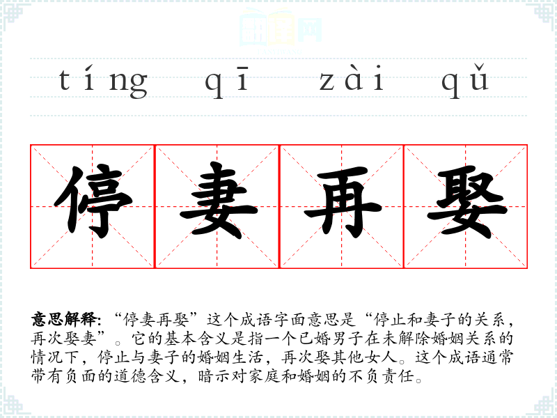 “停妻再娶”这个成语字面意思是“停止和妻子的关系,再次娶妻”。它的基本含义是指一个已婚男子在未解除婚姻关系的情况下,停止与妻子的婚姻生活,再次娶其他女人。这个成语通常带有负面的道德含义,暗示对家庭和婚姻的不负责任。