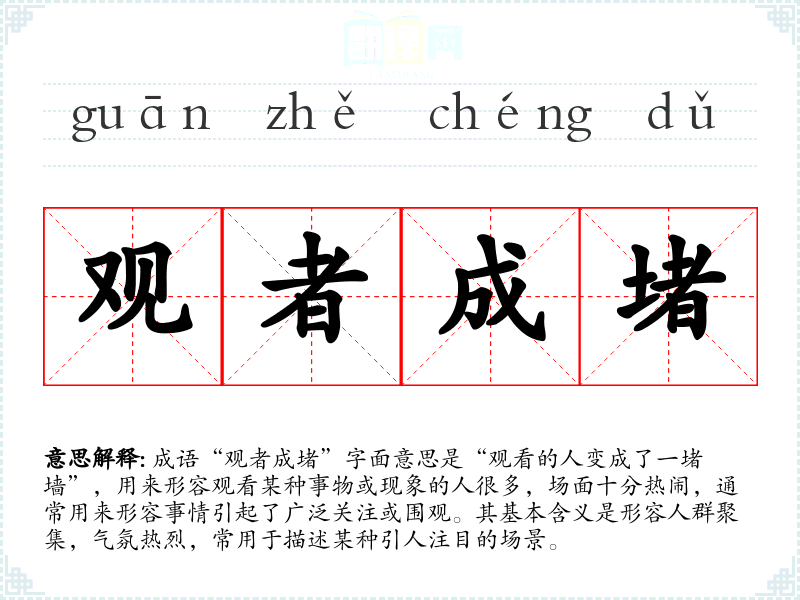 在英语中,类似的表达有“a crowd gathered”或“a throng of spectators”,它们同样传达出围观人群的热烈场景,但通常不如“观者成堵”那样形象生动。