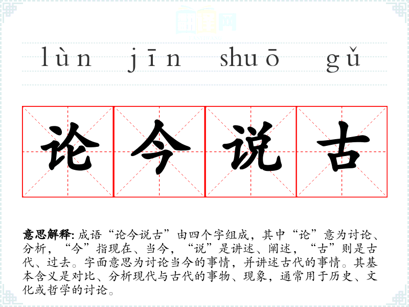 成语“论今说古”由四个字组成,其中“论”意为讨论、分析,“今”指现在、当今,“说”是讲述、阐述,“古”则是古代、过去。字面意思为讨论当今的事情,并讲述古代的事情。其基本含义是对比、分析现代与古代的事物、现象,通常用于历史、文化或哲学的讨论。