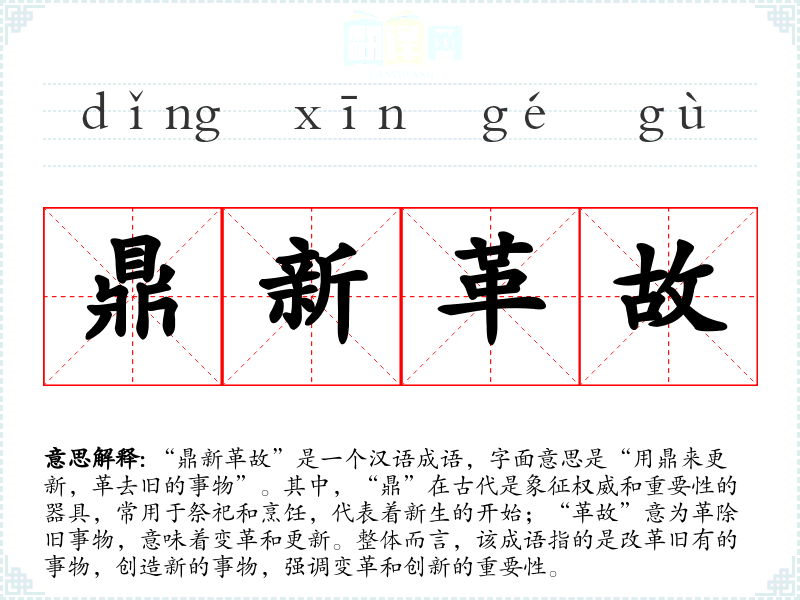 “鼎新革故”源自于古代的文化背景,尤其与周朝的礼仪和制度有密切关系。鼎作为一种重要的祭祀器具,象征着国家的稳定和繁荣。在文人墨客的作品中,常常使用“鼎”来象征新的开始和重要的改革。虽然该成语的具体出处不详,但其意涵在历史上一直被广泛引用,尤其是在强调变革和创新的时期。