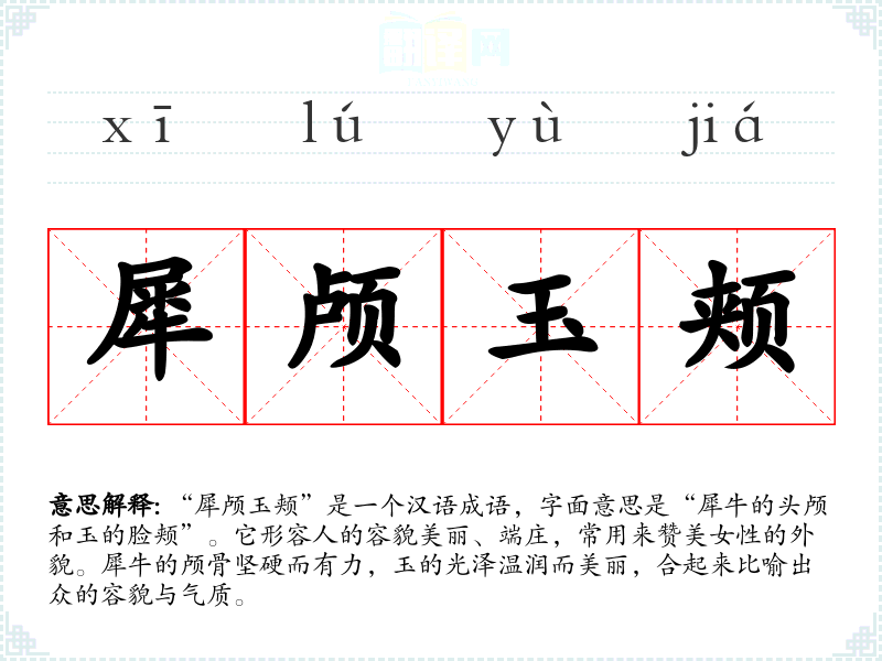 “犀颅玉颊”是一个汉语成语,字面意思是“犀牛的头颅和玉的脸颊”。它形容人的容貌美丽、端庄,常用来赞美女性的外貌。犀牛的颅骨坚硬而有力,玉的光泽温润而美丽,合起来比喻出众的容貌与气质。