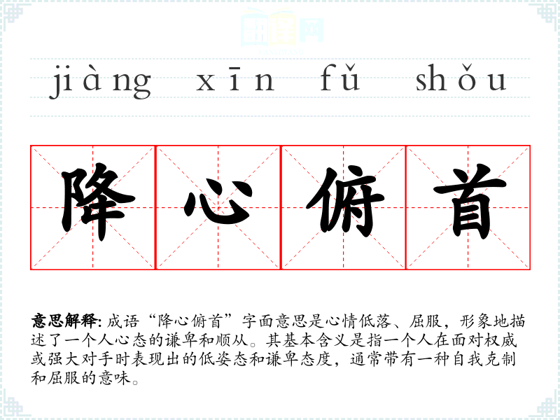 在**传统文化中,谦卑被视为一种美德,尤其是在儒家思想中,强调尊重他人和谦逊的态度。因此,“降心俯首”不仅是一个行为表现,也是社会关系中的一种重要价值观。在现代社会中,虽然竞争逐渐加剧,但谦逊和适时的低姿态仍然被认为是处理人际关系的智慧。