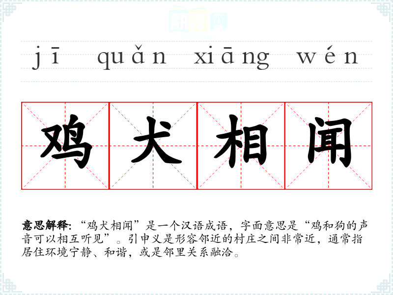 “鸡犬相闻”是一个汉语成语,字面意思是“鸡和狗的声音可以相互听见”。引申义是形容邻近的村庄之间非常近,通常指居住环境宁静、和谐,或是邻里关系融洽。